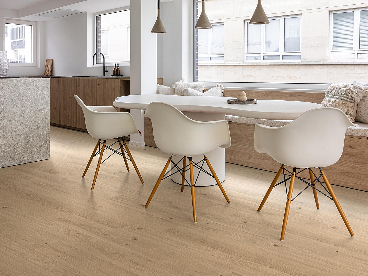 CORETEC Proplus spája minimalistický vzhľad s vysokou odolnosťou. Vďaka povrchu EIR (Embossed In Register) je reliéf synchrónny s kresbou, takže drevo pôsobí maximálne autenticky. Procore® jadro, 0,55 mm nášľapná vrstva a 1 mm integrovaná korková podložka pre teplý, tichý krok. Plávajúce click (angle tap) bez aklimatizácie, 100% vodeodolná konštrukcia; vhodné pre byty aj komerciu.