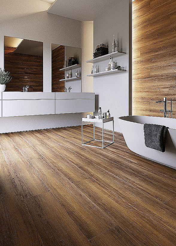Estetika – Vďaka technológii dekoru verne napodobňujúcej drevo, kameň či betón, takže kúpeľňa nemusí vyzerať ako typická „rustikálna dlažba“. Môžete vytvoriť moderný alebo naopak hrejivý štýl.